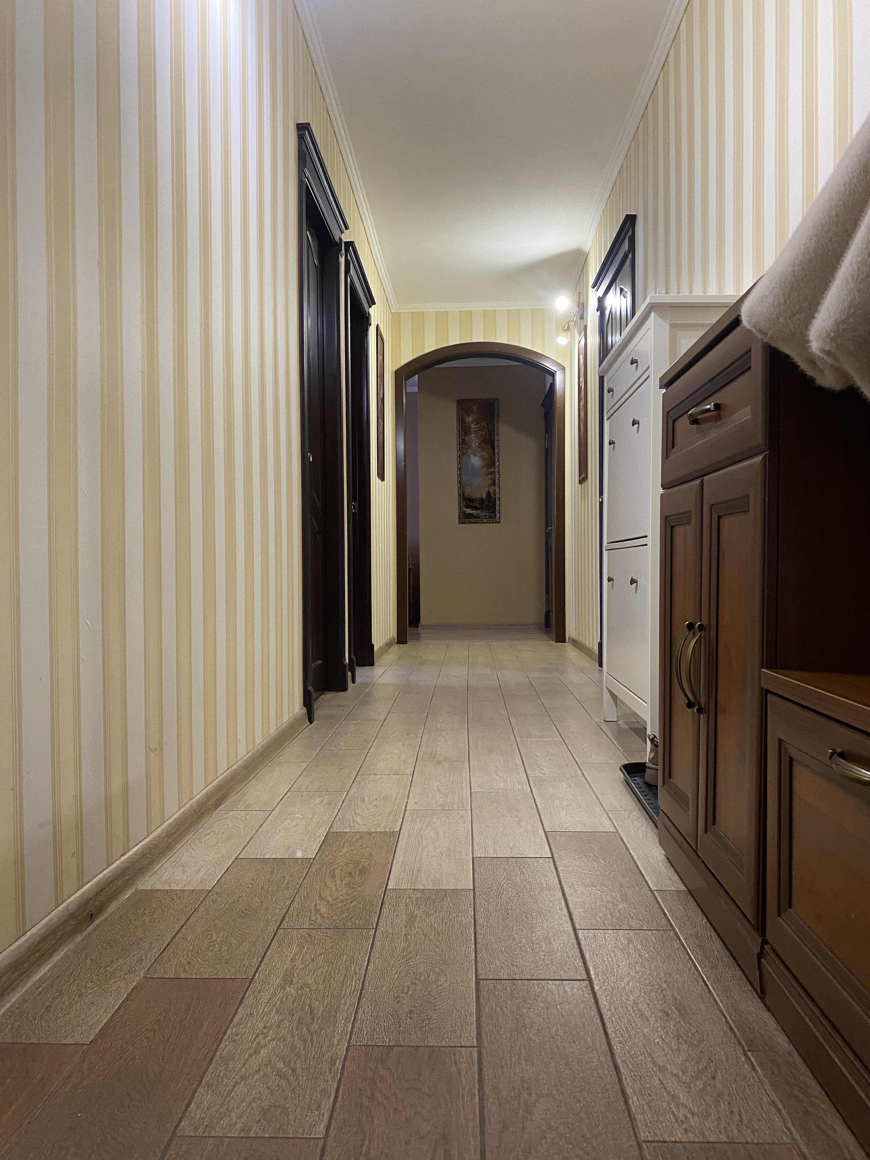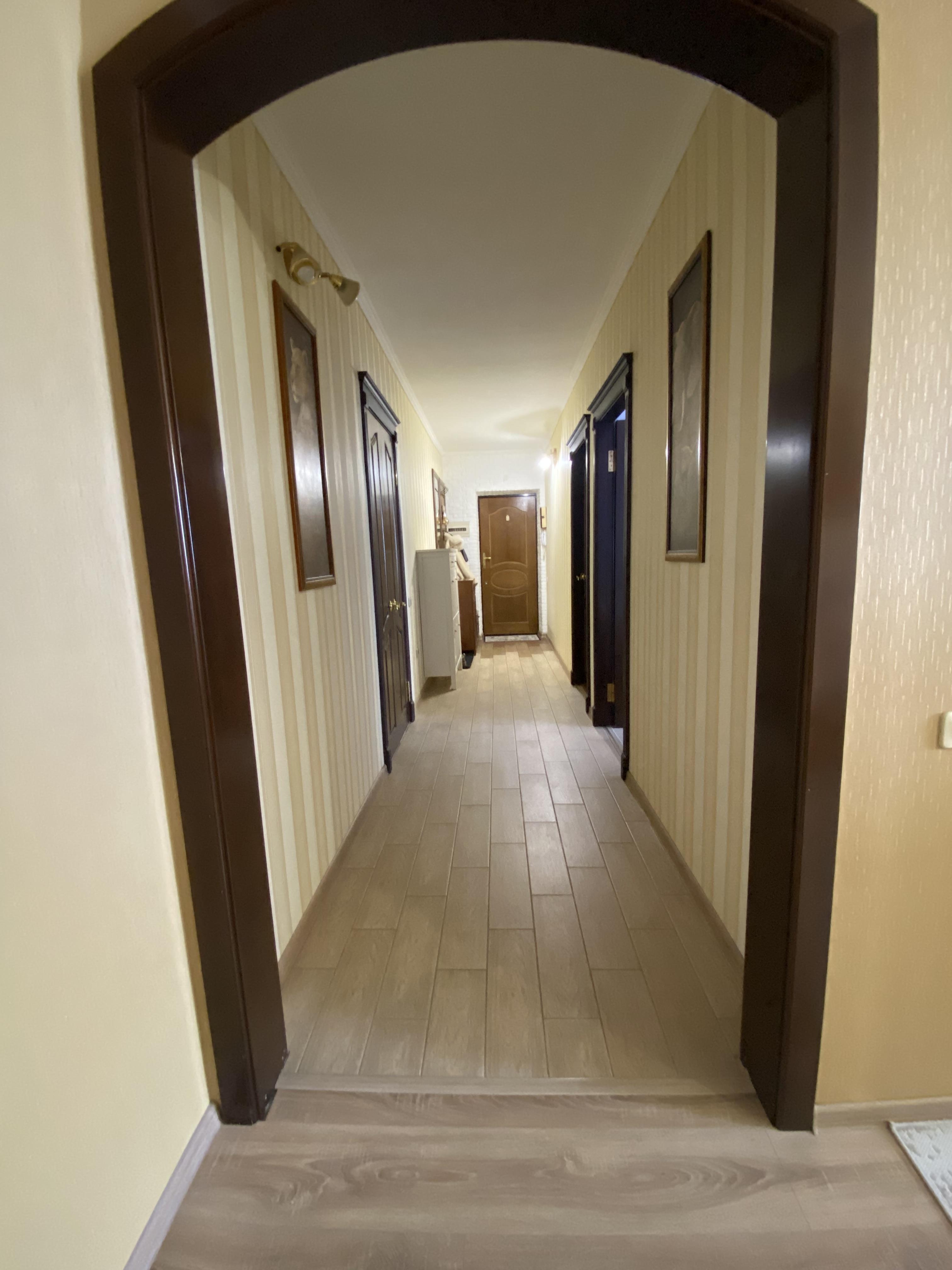 Общая площадь — 84,5 кв. м, не считая двух лоджий. Выполнен современный ремонт из качественных материалов. В квартире есть просторная кухня (9 кв. м), изолированные комнаты, гардеробная. На полу — ламинат и керамогранит. В кухне и на лоджиях — теплый пол, натяжные потолки, пластиковые окна, водонагреватель и сплит-системы. Квартира выходит на две стороны.